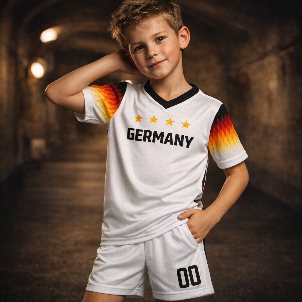 Este equipamento infantil captura a essência da Seleção Alemã. Veste os teus filhos e vê o brilho nos olhos deles ao sentirem-se parte da equipa. No estádio, no recreio ou em casa a torcer pelo próximo golo histórico. Porque apoiar Alemanha não é só para os grandes… é uma emoção que passa de geração em geração.