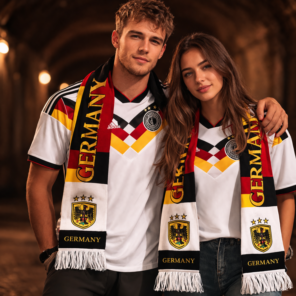 Este kit união captura a essência da Seleção Alemã para casais. Vistam as camisolas juntos, enrolem os cachecóis ao pescoço e hasteiem a bandeira. Sintam que estão unidos à equipa e a milhões de torcedores. No estádio de mãos dadas, na varanda a vibrar juntos ou em casa a torcer pelo próximo golo histórico. Porque apoiar Alemanha não é só cultura… é uma emoção partilhada que dura para sempre.